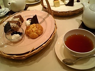 私が選んだのは、紅茶はキームン、デザートはスコーンと季節のショートケーキ(今は栗とバナナのショートケーキ)と、あと・・・なんだったかな、チョコレートブラウニーっぽいのです。